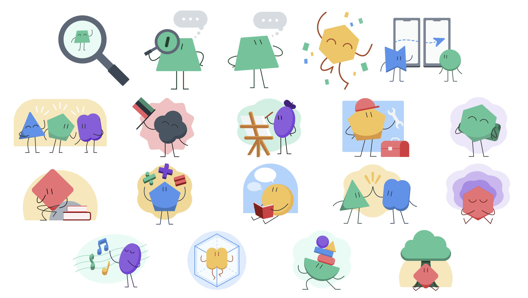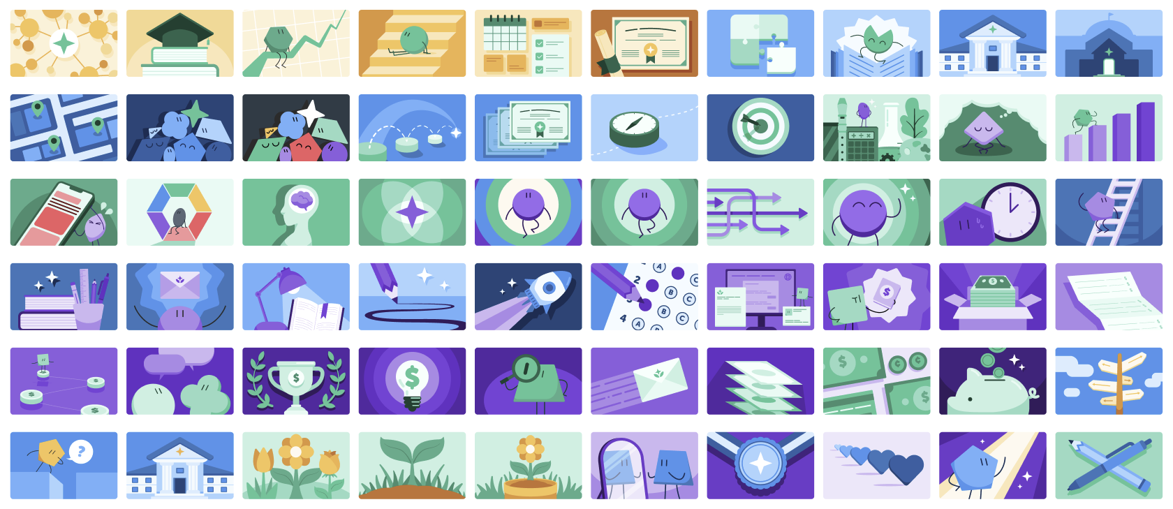 As the sole illustrator on the team, I was charged with creating any and all illustrations for the app experience and beyond. I established an illustration system of colors, shape language, and characters, which I used to create quality visuals efficiently and consistently for course thumbnails and spot illustrations.
