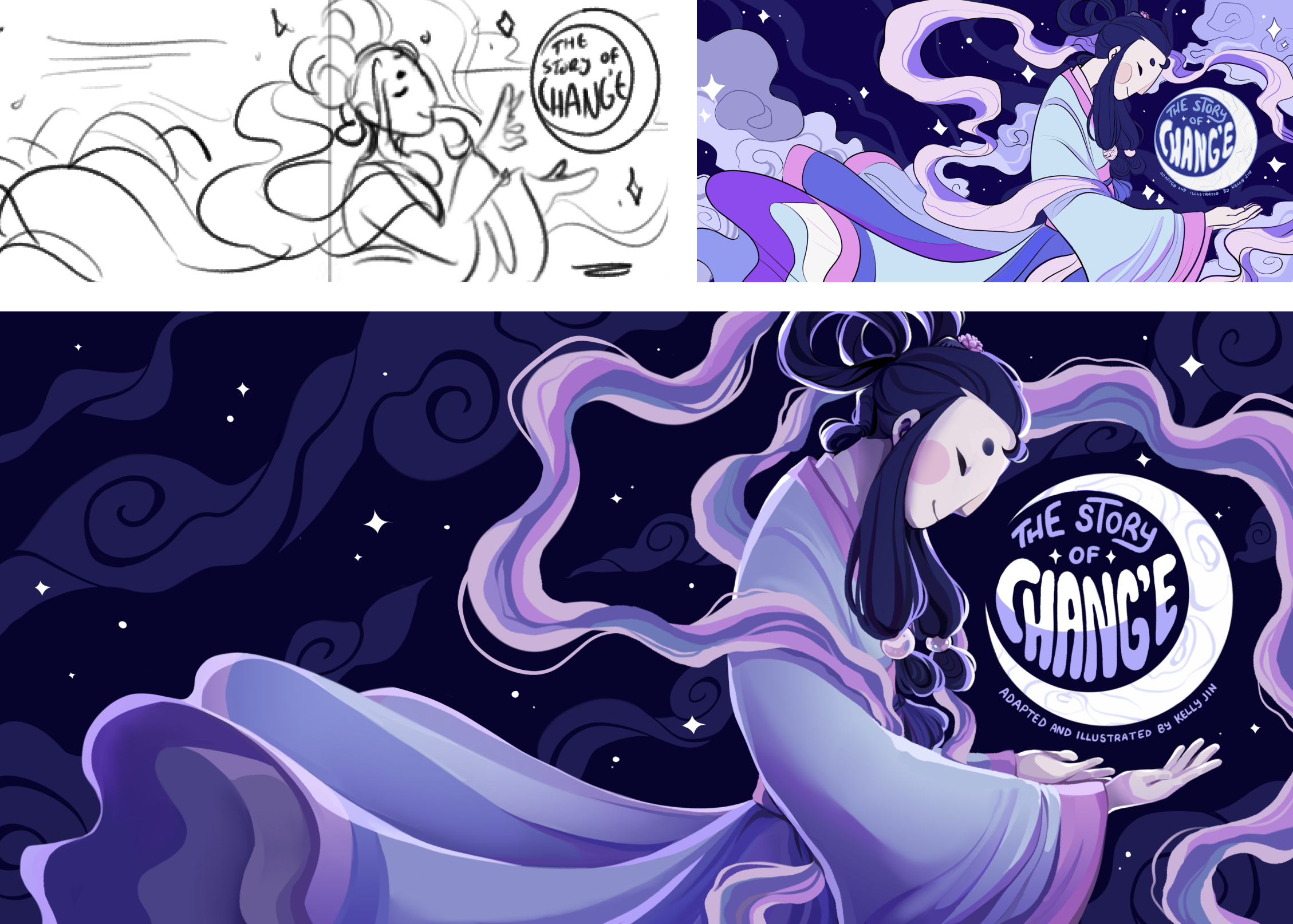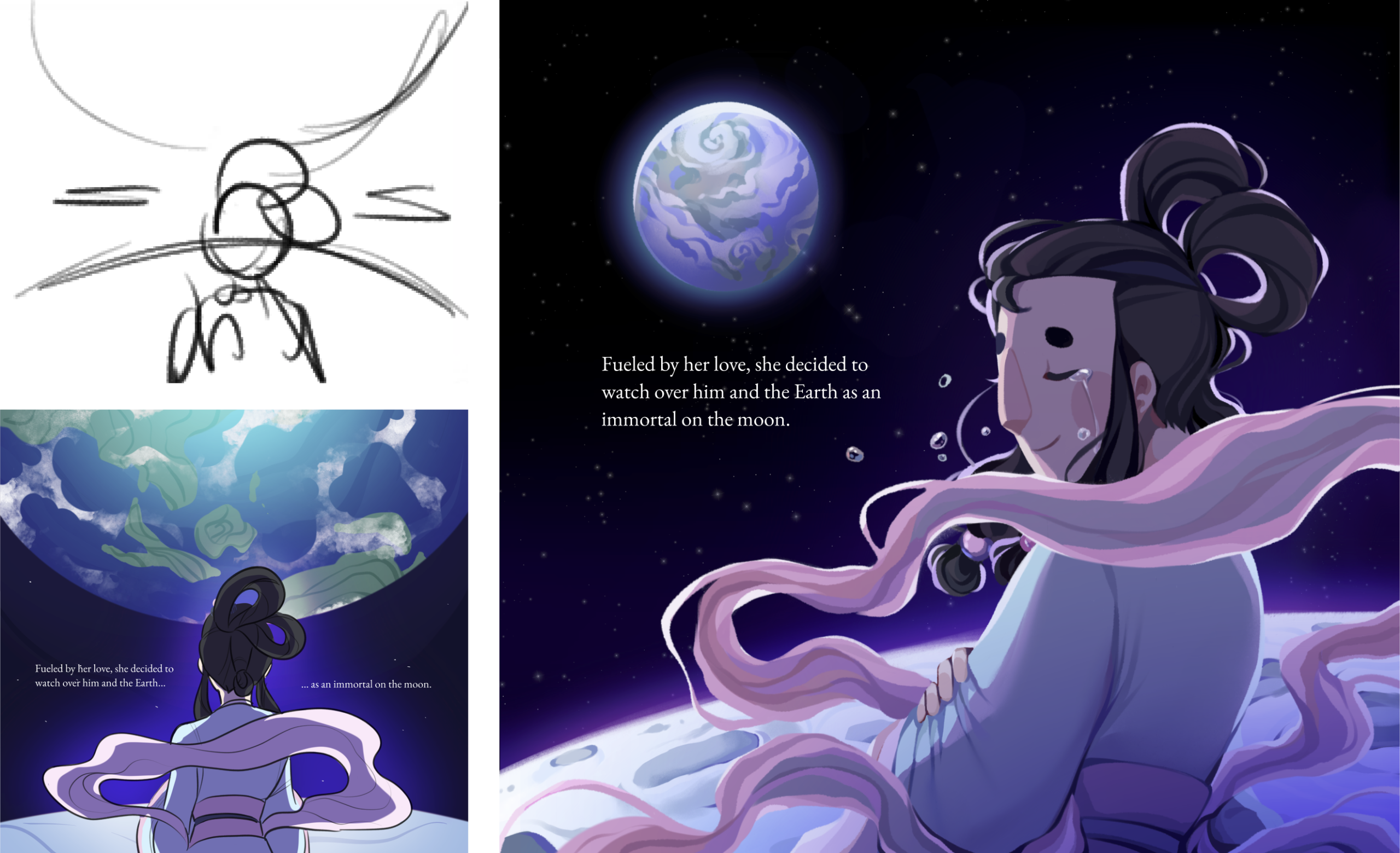 My identity as a first generation Chinese immigrant and artist has shaped every aspect of my life. I wanted to illustrate a story that lets me honor and share my roots with a younger audience.I chose to create a children's storybook version of Chang’e, which is a famous old Chinese folktale. It revolves around Chang’e, who became immortal through her love and now resides on the moon.